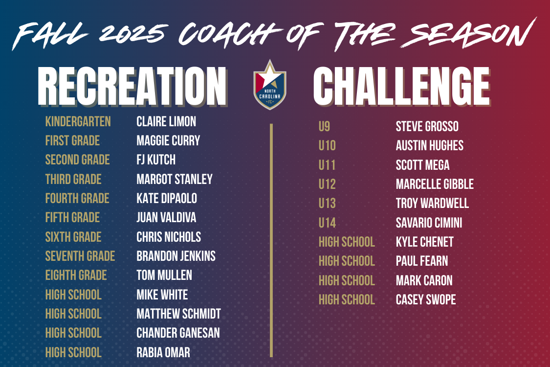 Congratulations to our Fall 2025 Coaches of the Season! We are proud to have you on our team and applaud your continued commitment to the development of our players! The following coaches were nominated by their team for going above and beyond the duty "coach" and selected to receive a gift certificate to SOCCER.com!