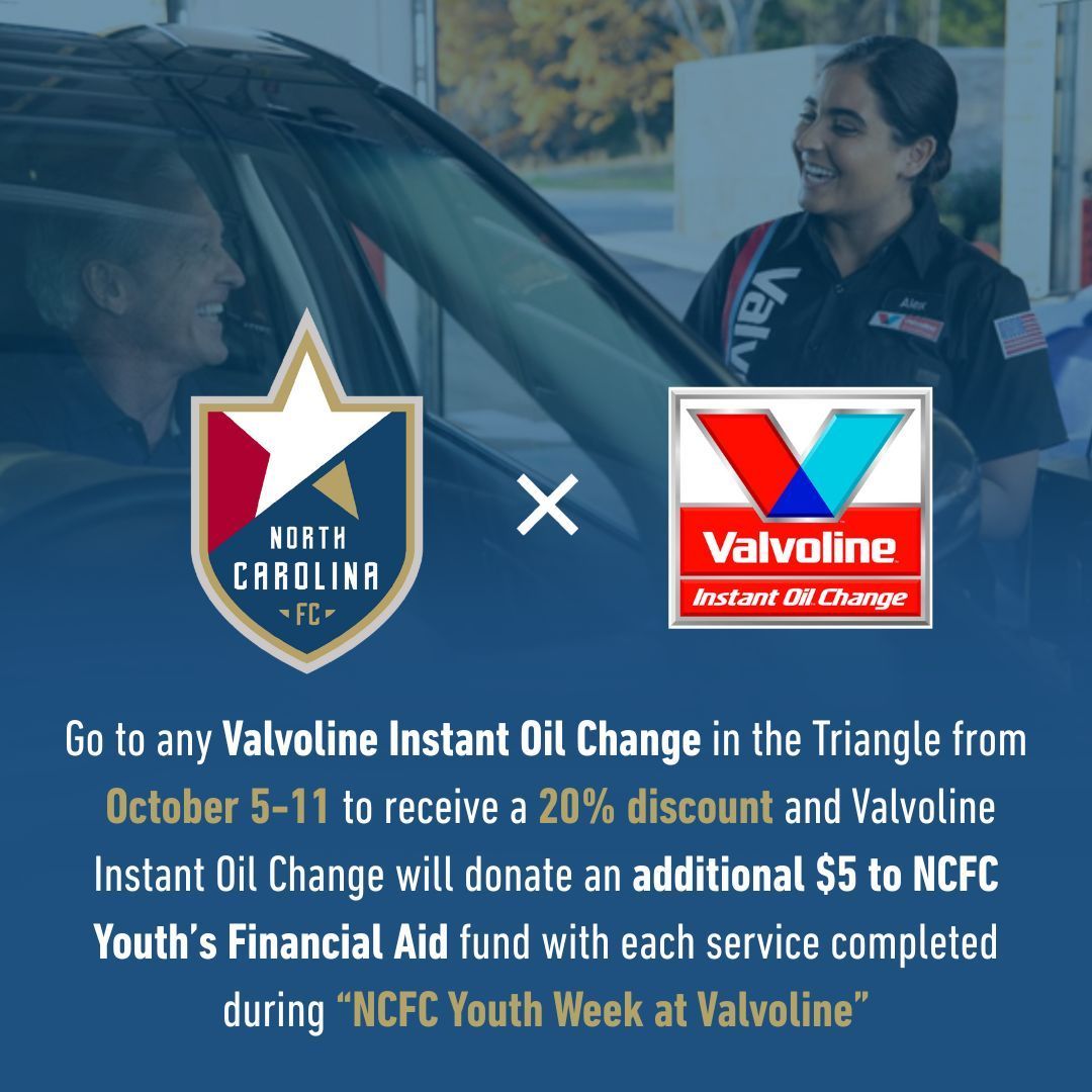 Additionally, Valvoline Instant Oil Change has a special offer from October 5-11 for all NCFC Youth families. As part of the sponsorship, Valvoline Instant Oil Change will host an “NCFC Youth Week” at locations across the Triangle. NCFC Youth families will receive 20% off the total bill of any service (safety/emissions checks and battery exclusions apply).